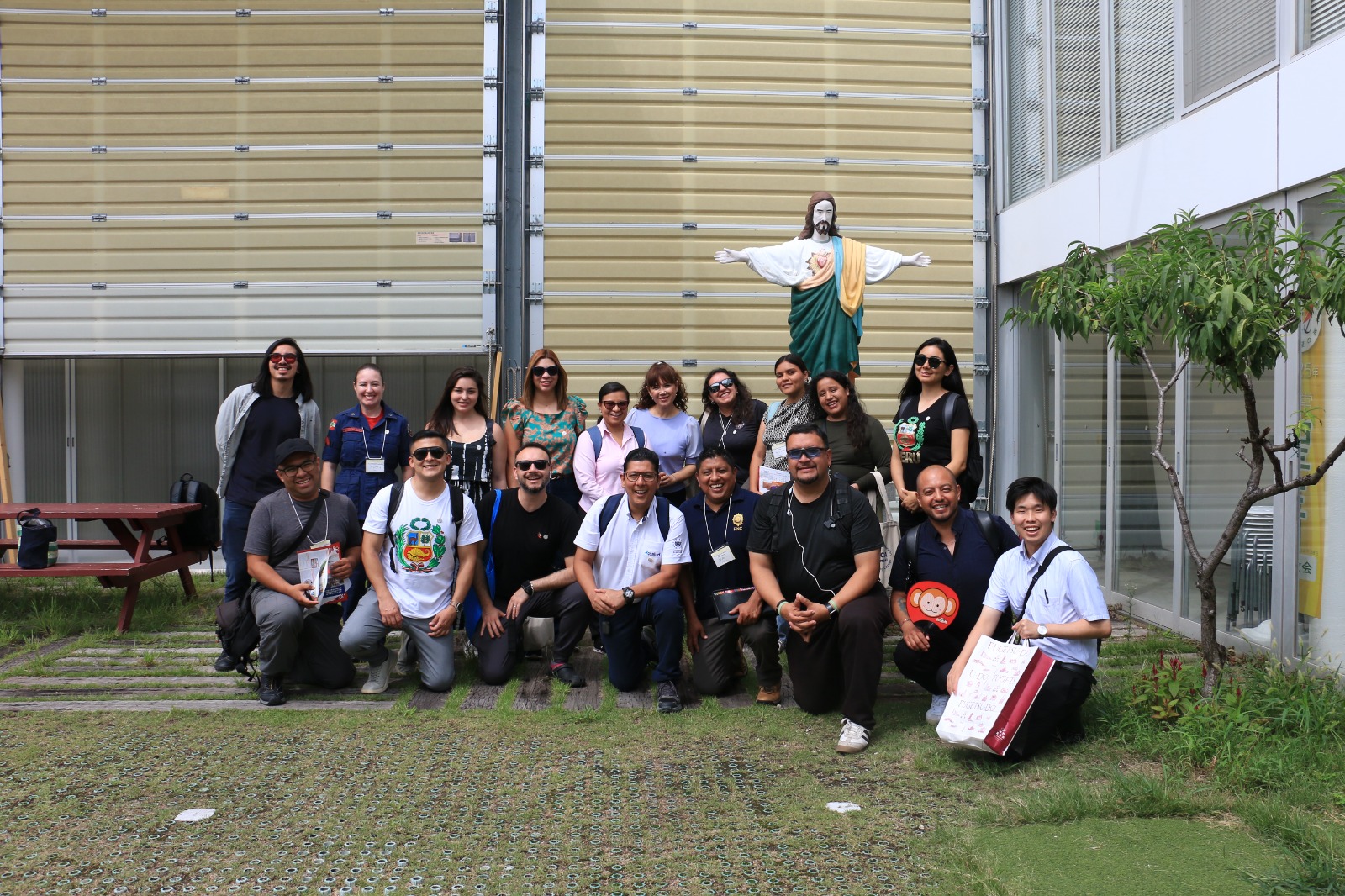 Delegación latinoamericana becada por JICA en 2025, en la Iglesia/Centro de Takatori, Kobe, junto a Roxana Oshiro (al centro), espacio que nació tras el terremoto de 1995 como punto de apoyo a migrantes.