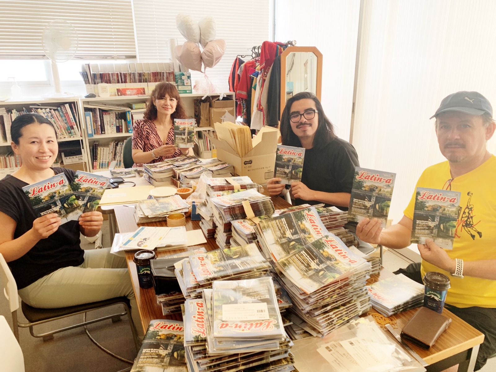 Equipo de la revista comunitaria Latin-a en Kobe, con Roxana Oshiro al frente, preparando el envío de ejemplares con información en español para residentes latinoamericanos en Japón.